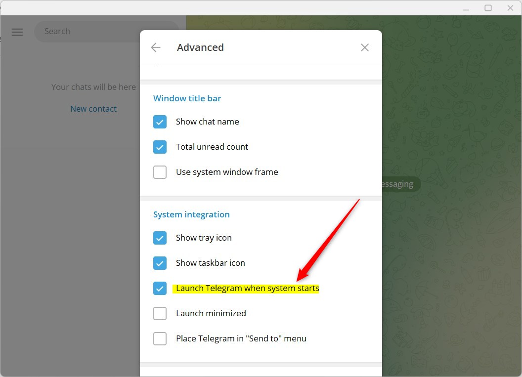 В расширенном меню «Дополнительно» в разделе «Системная интеграция» установите флажок рядом со строкой «Запускать Telegram при запуске системы», чтобы включить его.