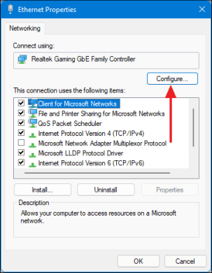 Появится новое диалоговое окно с надписью «Свойства Ethernet». Оттуда нажмите «Настроить…».