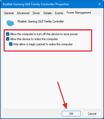 Убедитесь, что все три поля помечены как «Разрешить компьютеру выключать это устройство для экономии энергии», «Разрешить этому устройству выводить компьютер из спящего режима» и «Разрешить только волшебному пакету для пробуждения компьютера».