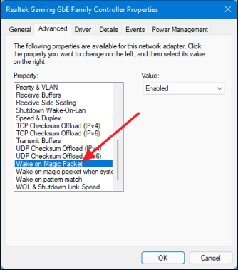 После этого перейдите на вкладку «Дополнительно». Здесь прокрутите список свойств и убедитесь, что для параметра «Wake on Magic Packet» установлено значение «Включено».