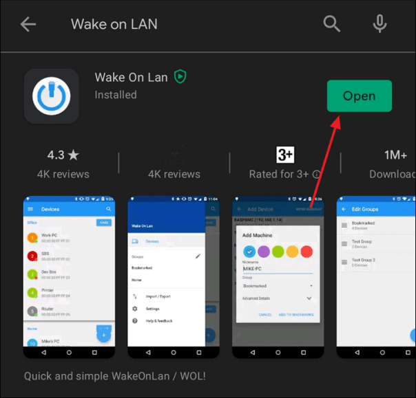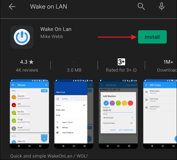 После того, как откроется Play Store, введите «Wake on LAN» в строке поиска, расположенной в верхней части экрана, и появится приложение «Wake On Lan» от разработчика Майка Уэбба. Нажмите кнопку «Установить» в правой части экрана.