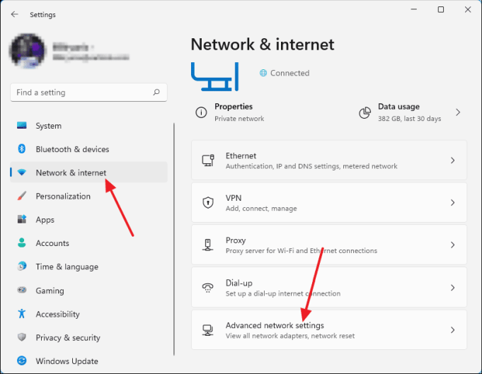 В окне «Настройки» выберите «Сеть и Интернет» на левой панели, а затем «Дополнительные настройки сети».