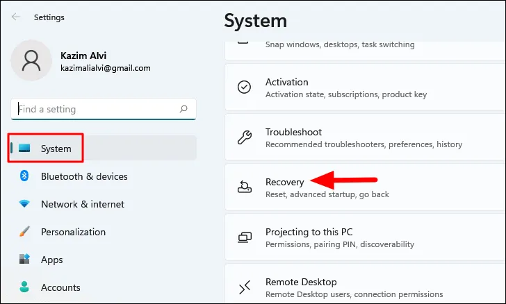 На вкладке «Система» в настройках справа выберите «Восстановление».