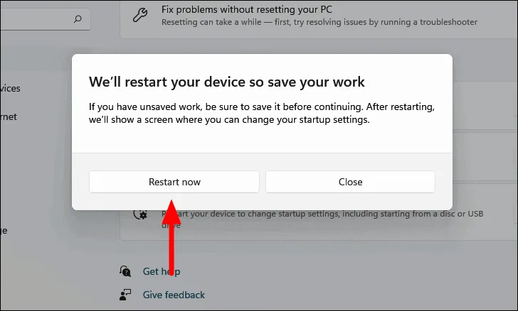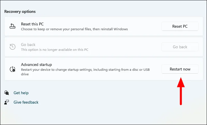 Затем нажмите «Перезагрузить сейчас» рядом с «Расширенный запуск» в разделе «Параметры восстановления», чтобы перезагрузить компьютер в Windows RE.