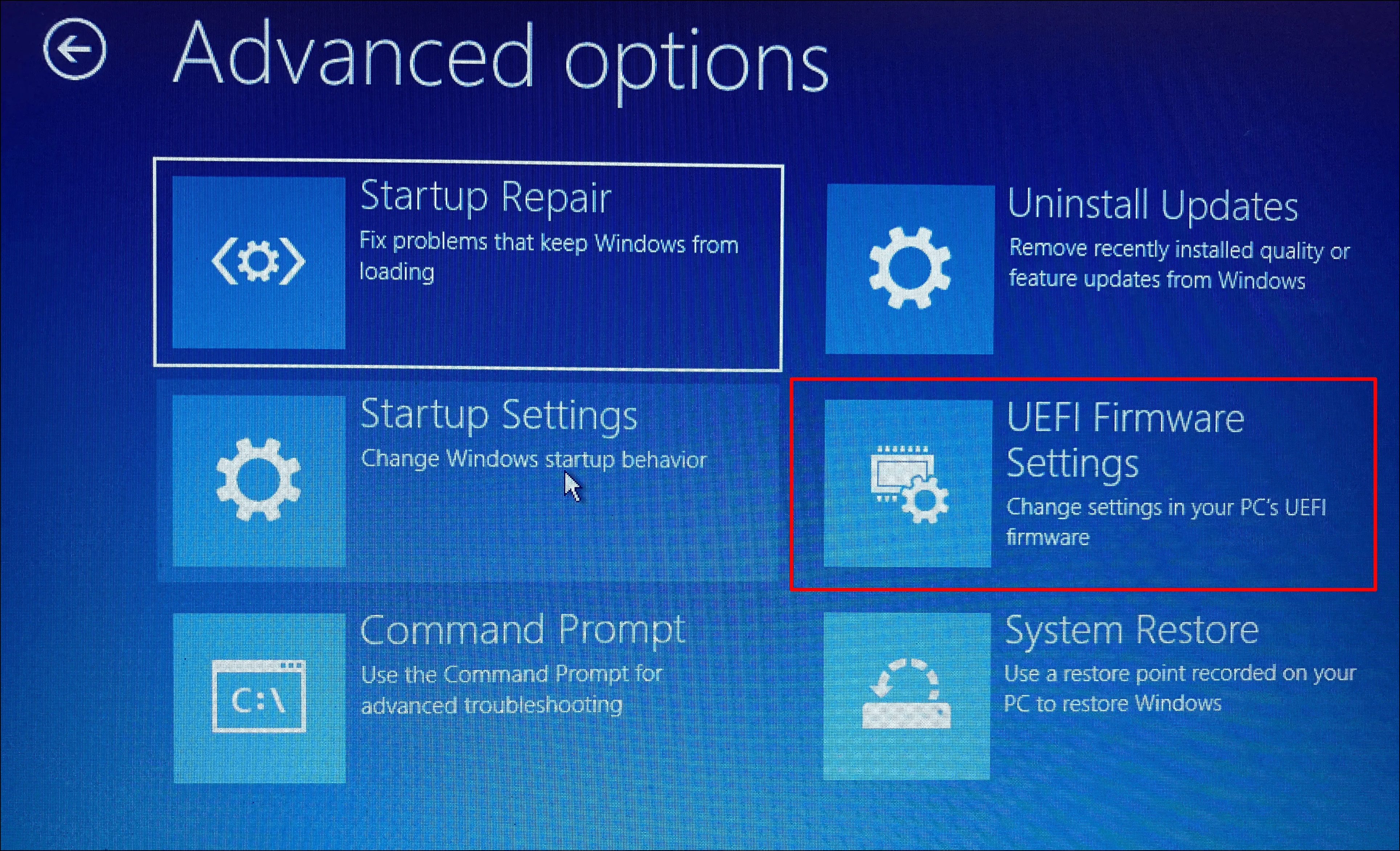 Теперь вы найдете шесть вариантов в разделе «Дополнительные параметры», выберите «Настройки прошивки UEFI».