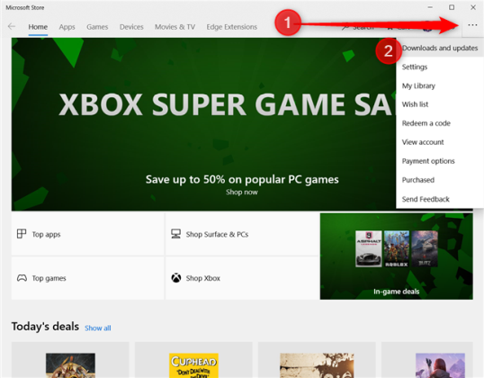 В приложении Microsoft Store нажмите или коснитесь кнопки меню «…» (три точки) в правом верхнем углу. В открывшемся меню нажмите или нажмите «Загрузки и обновления».