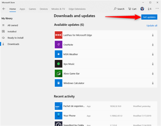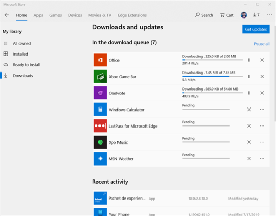 Магазин Microsoft загружает новую страницу, где вы можете увидеть «Доступные обновления» и «Недавние действия». Вы видите приложения и игры, которые вы недавно загрузили с помощью Магазина Microsoft, и когда они были в последний раз изменены.