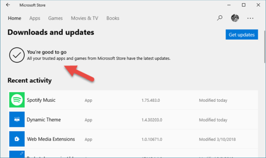 Когда все установленные приложения обновлены, в Магазине Майкрософт отображается сообщение о том, что «Вы в порядке» и «Все ваши доверенные приложения и игры из Магазина Microsoft имеют последние обновления».