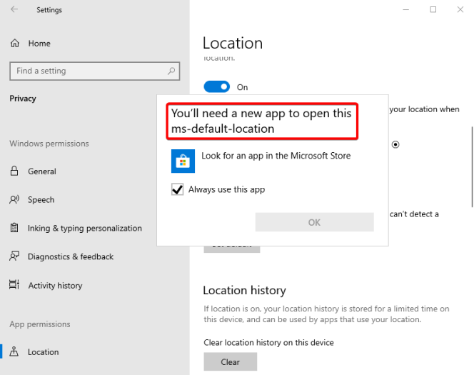 «Вам понадобится новое приложение, чтобы открыть это ms-default-location».