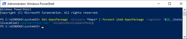 Get-AppxPackage -allusers *Maps* | foreach {Add-AppxPackage -register "$($_.InstallLocation)appxmanifest.xml" -DisableDevelopmentMode}
