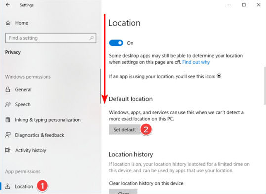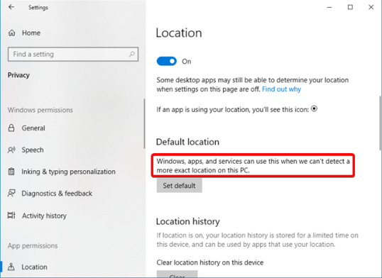 ПРИМЕЧАНИЕ. Установка местоположения по умолчанию в Windows 10 гарантирует, что соответствующее местоположение всегда будет доступно для ваших приложений и служб. Если у вас есть сомнения по поводу конфиденциальности данных о вашем местоположении, мы рекомендуем вам просмотреть эту информацию на портале конфиденциальности Microsoft.