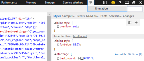 • На правой панели, которая открывается, ищите Эмуляцию сверху. В зависимости от размера вашего разрешения вы, возможно, не сможете сначала найти его, но если вы нажмете на стрелку, указывающую вниз во всплывающей подсказке Дополнительные инструменты, вы найдете его.