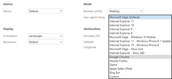 Параметры эмуляции Edge достаточно надежны, что позволяет вам изменять свое устройство, ориентацию/разрешение экрана, геолокацию и строку пользовательского агента.