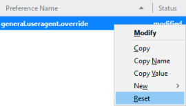 • После ввода строки user-agent нажмите Enter , и все. Этот параметр будет оставаться неизменным при каждом перезапуске браузера. Если вы хотите сбросить этот параметр до значения по умолчанию, просто щелкните правой кнопкой мыши имя предпочтения и выберите «Сброс».