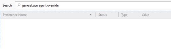 • Затем в поле «Поиск» в верхней части этого экрана введите general.useragent.override. Скорее всего, вас встретит пустой экран. Если ваш поиск находит предпочтение, перейдите вниз по этой странице, чтобы изменить его значение.