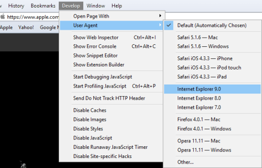 • Затем нажмите на пункт меню «Разработка», наведите курсор на User Agent, и вы увидите список пользовательских агентов, на которых вы можете переключиться.