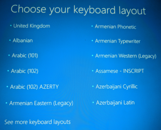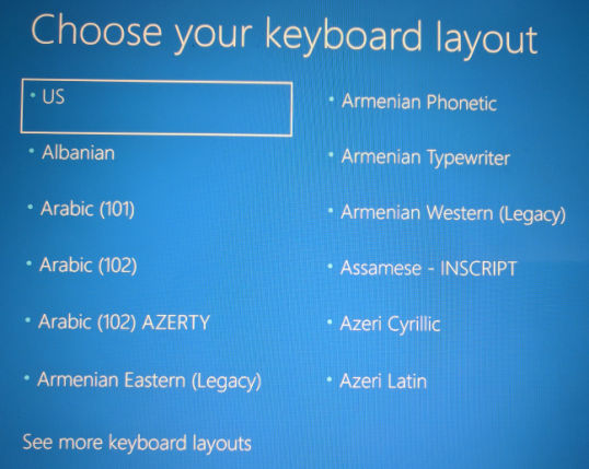 Когда диск восстановления загружается, он сначала попросит вас выбрать раскладку клавиатуры. Выберите тот, который вы хотите использовать.