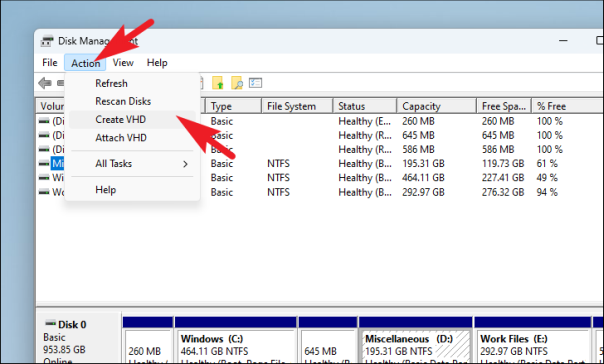 Теперь перейдите на вкладку «Действие» и выберите параметр «Создать виртуальный жесткий диск». Это откроет отдельное окно на вашем экране.