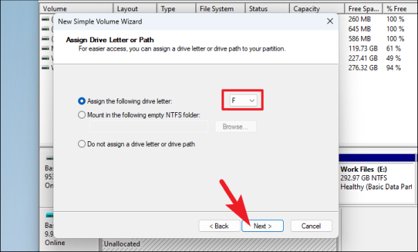 После этого назначьте букву диска, выбрав ее в раскрывающемся меню. Затем нажмите кнопку «Далее».