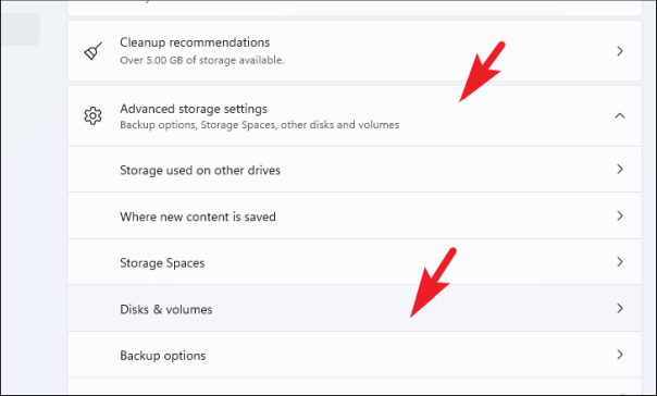 Затем щелкните плитку «Дополнительные параметры хранилища», чтобы развернуть ее, а затем щелкните параметр «Диски и тома», чтобы продолжить.