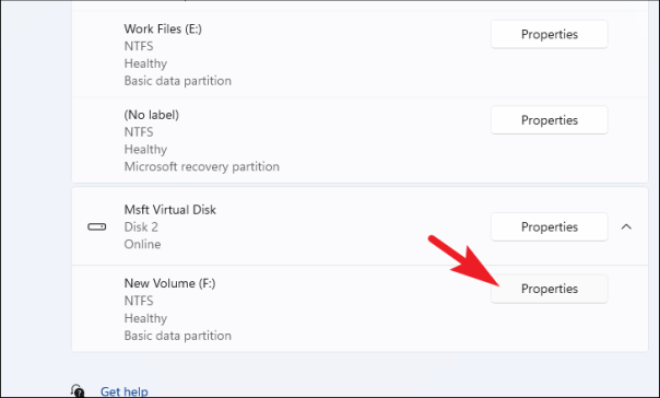 Теперь выберите только что созданный том и нажмите кнопку «Свойства».