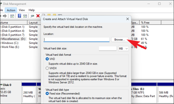 Примечание. Чтобы создать виртуальный диск, Windows уменьшит размер выбранного диска на размер, указанный вами для размещения на виртуальном диске. Более того, поскольку виртуальный диск динамически расширяется, если он превышает указанный размер, это еще больше уменьшит основной диск на вашем компьютере.
