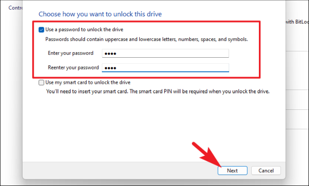 После этого установите флажок перед опцией «Использовать пароль для разблокировки диска». Затем введите пароль, который вы хотите использовать для диска, и нажмите кнопку «Далее».