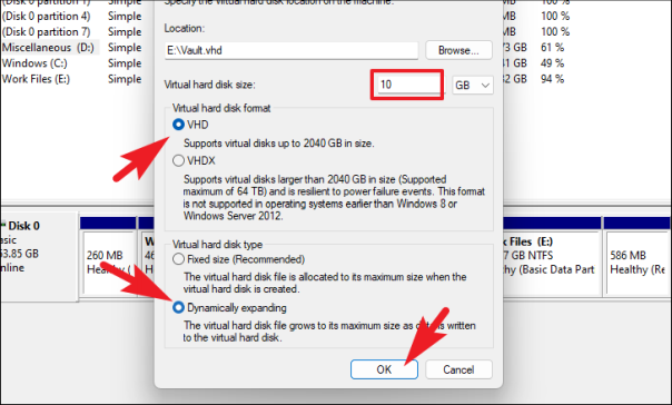 Затем щелкните переключатель перед опцией «VHDX». После этого введите размер диска, который вы хотите создать. Затем щелкните переключатель перед параметром «Динамическое расширение». Наконец, нажмите кнопку «ОК».