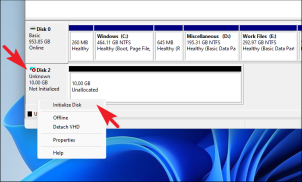 После создания виртуального диска щелкните правой кнопкой мыши диск в нижней части окна и выберите параметр «Инициализировать диск». Это откроет отдельное окно на вашем экране.