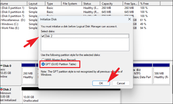 Теперь установите флажок перед названием диска. После этого щелкните переключатель перед опцией «GPT». Наконец, нажмите кнопку «ОК».