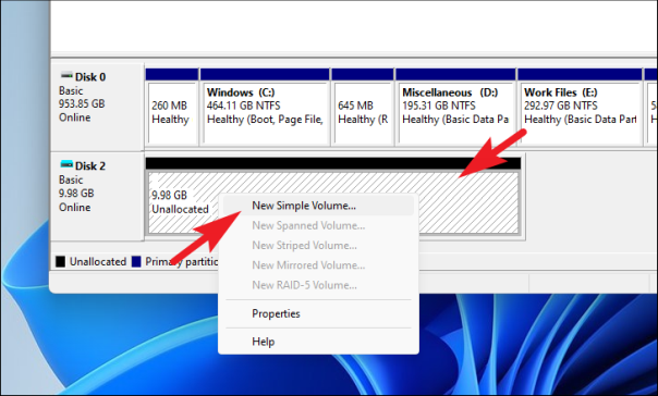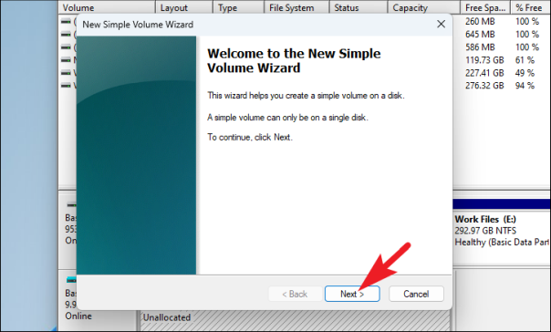 Затем щелкните правой кнопкой мыши нераспределенное пространство, представленное черной полосой, и выберите параметр «Новый простой том». Это откроет отдельное окно на вашем экране.