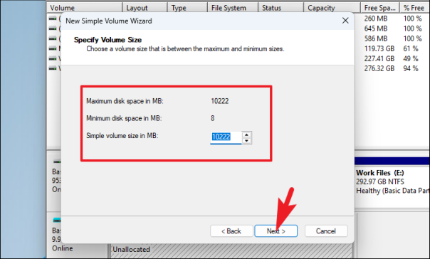 Затем оставьте параметр размера тома по умолчанию. Нажмите кнопку «Далее».