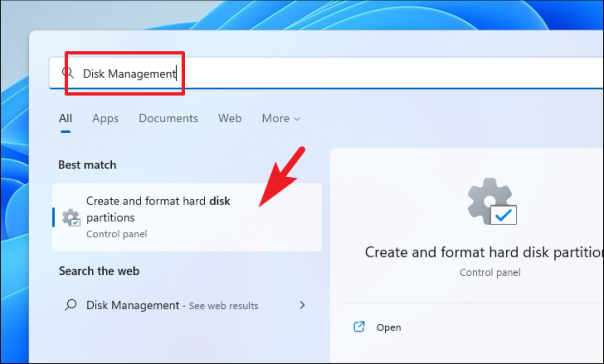 Сначала перейдите в меню «Пуск» и введите «Управление дисками», чтобы выполнить поиск. После этого нажмите на плитку «Создать и отформатировать разделы жесткого диска», чтобы продолжить.