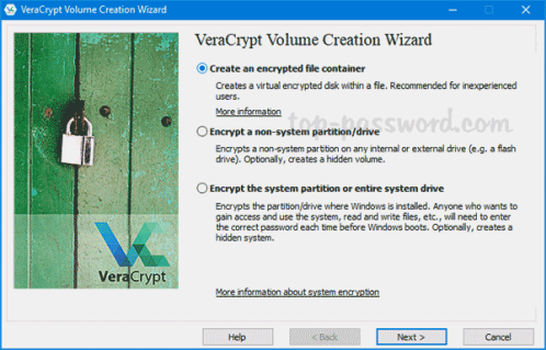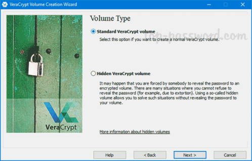 - VeraCrypt поддерживает два разных типа зашифрованных томов. Здесь мы выбираем «Стандартный том VeraCrypt».