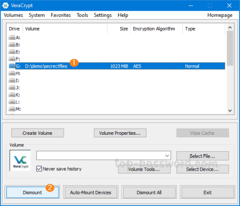 Не забудьте отключить том VeraCrypt, если вам больше не нужно с ним работать. В интерфейсе VeraCrypt выберите букву диска подключенного тома и нажмите кнопку «Отключить».