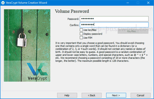 - Введите пароль тома, который позже будет использован для монтирования этого образа виртуального диска.