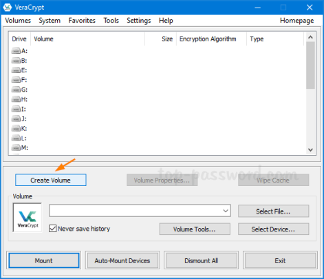 - Когда вы откроете VeraCrypt, вы увидите список неиспользуемых букв дисков. Для начала нам нужно создать защищенный образ виртуального диска (он же «контейнер зашифрованных файлов»). Нажмите кнопку «Создать том».