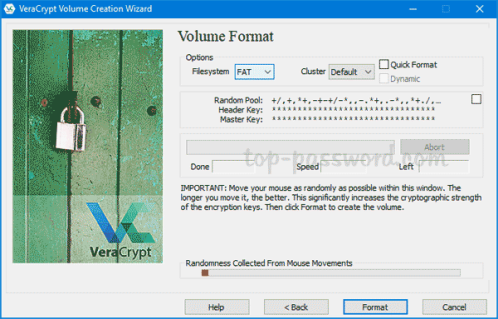 - Выберите, какую файловую систему вы хотите использовать. Рекомендуется выбирать NTFS, чтобы вы могли использовать файлы размером более 4 ГБ. Чтобы сгенерировать надежные ключи шифрования, просто перемещайте мышь случайным образом, пока синяя полоса не достигнет конца. Щелкните Форматировать .