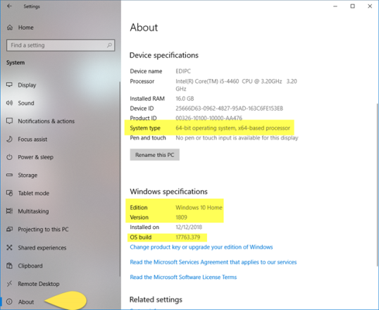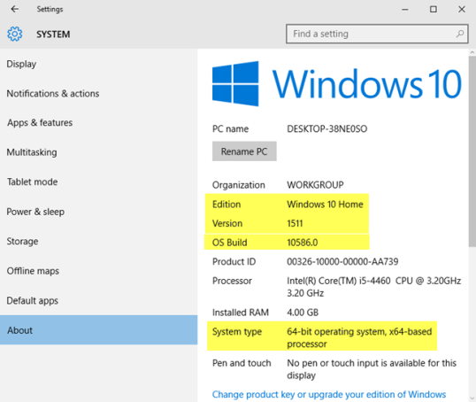 Эти строки информации расположены по-разному, в зависимости от используемой версии Windows 10. Например, вот как выглядит раздел «О программе» в обновлении Windows 10 от 2015 года. Упомянутые нами строки существуют и здесь, но в другом месте.