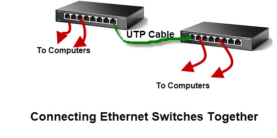 Если вам не хватает портов Ethernet в каком-либо месте, вы можете использовать второй коммутатор Ethernet, подключенный к другому коммутатору Ethernet, как показано на схеме ниже.