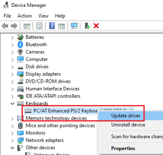 Разверните раздел «Клавиатура» и щелкните правой кнопкой мыши драйвер для проблемной клавиатуры.