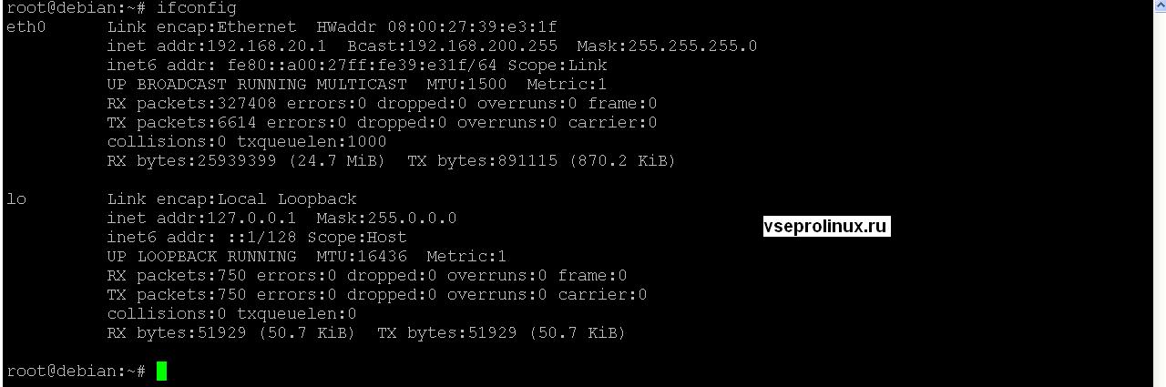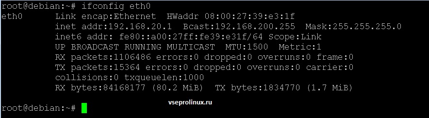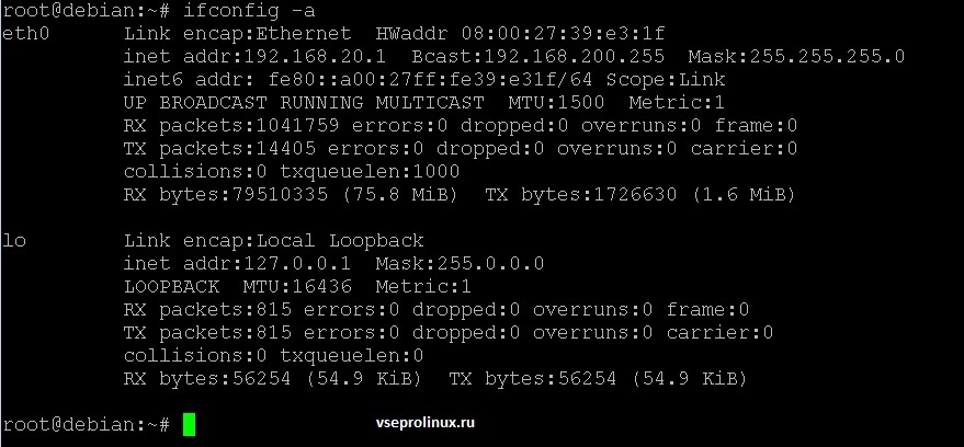 Как видно на скриншоте выше команда без ключей покажет информацию о всех включенных интерфейсах.