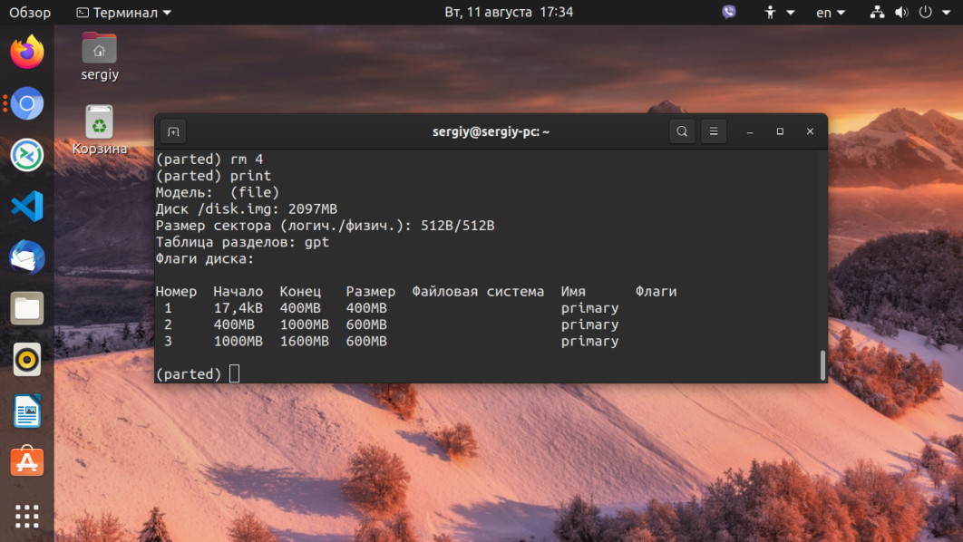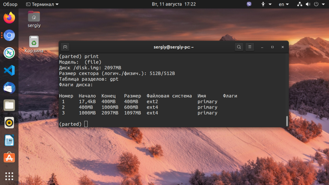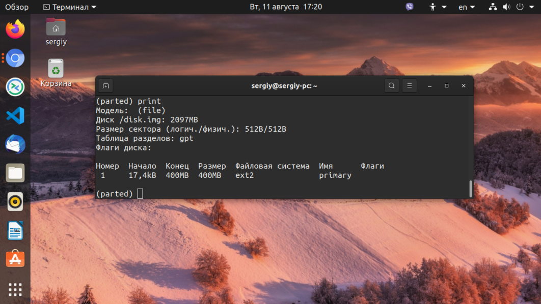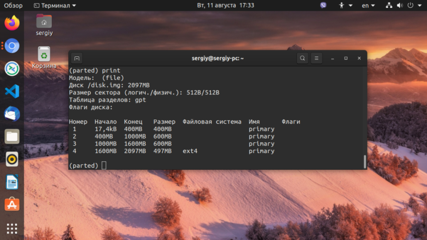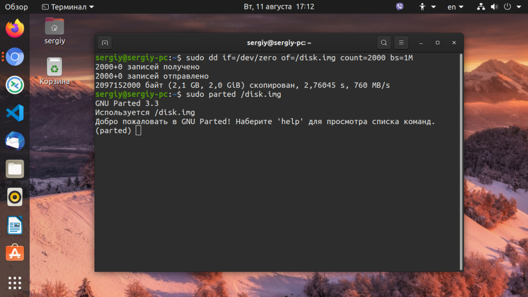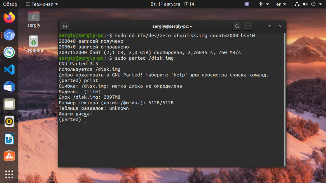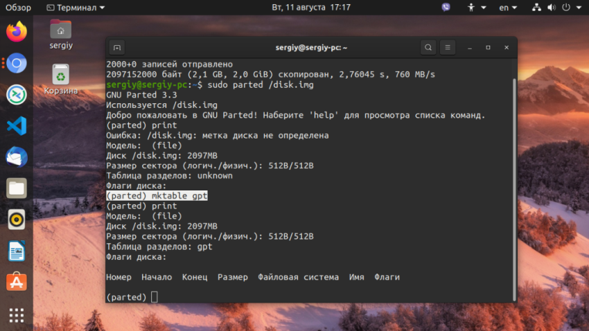 Таким образом, мы получим файл размером 2000 мегабайт, заполненный нулями, с которым можно спокойно работать. Запустим parted, передав ему вместо устройства наш файл: