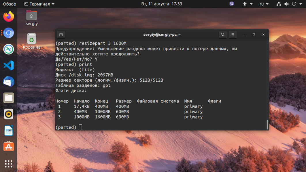 Параметр -0 означает вести отсчет от конца раздела, таким образом будет занято все доступное пространство под третий раздел. Смотрим что получилось: