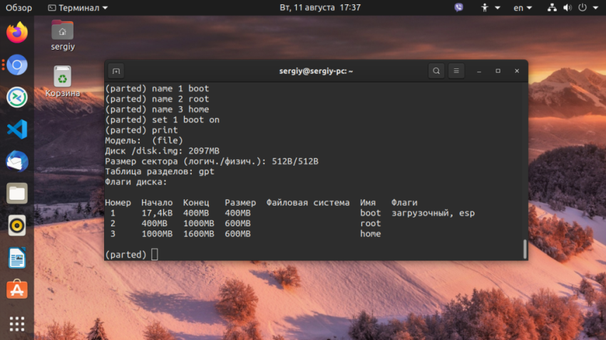 Будем мы создали таблицу разделов типа gpt, но можно выбрать одну из этих: aix, amiga, bsd, dvh, gpt_sync_mbr, gpt, mac, msdos, pc98, sun, loop