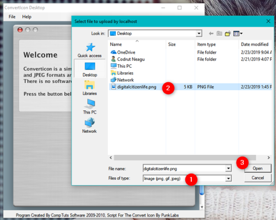 В диалоговом окне «Выбор файла для загрузки по локальному хосту» выберите «Изображение (png, gif, jpg)» в списке «Тип файлов». Затем просмотрите ваш компьютер и откройте файл изображения, который вы хотите преобразовать в формат файла ICO.