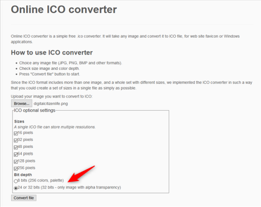 Третьим параметром, который вы можете изменить, является «Битовая глубина», которая может быть «8 бит (256 цветовая палитра)» или «24 или 32 бита (32 бита — только изображение с альфа-прозрачностью)». Если вы хотите получить высококачественную иконку, выберите второй вариант: «24 или 32 бита […]» . Он поддерживает 16 миллионов цветов, что означает, что создаваемые вами иконки более подробные и, вероятно, более красивые. Старые операционные системы использовали 8-битный вариант во времена, когда экраны не могли отображать больше цветов.