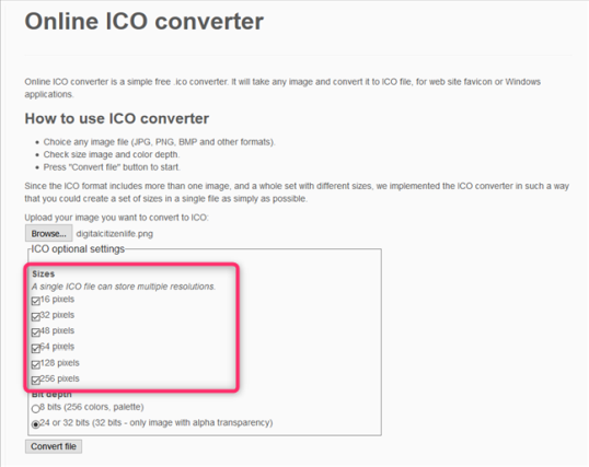 Далее вы выбираете разрешения, которые хотите использовать для полученного значка. Файлы ICO могут хранить несколько разрешений значков, чтобы они выглядели хорошо, независимо от того, насколько большими или маленькими вы предпочитаете свои значки в Windows. Если вы собираетесь использовать файл ICO в Windows 10, убедитесь, что вы отметили опцию «256 пикселей». Кроме того, если размер итогового файла ICO не является проблемой, вы можете проверить все доступные разрешения.