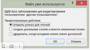 • Уведомить, когда исходная копия станет доступной. При этом файл открывается только для чтения, но как только другой пользователь закроет файл, то этот пользователь получит уведомление, о том что можно начинать редактировать файл.