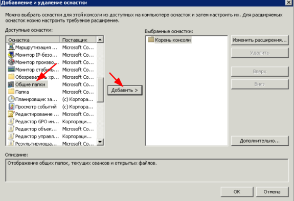 Выбираем оснастку «Общие папки» и добавляем её в консоль: